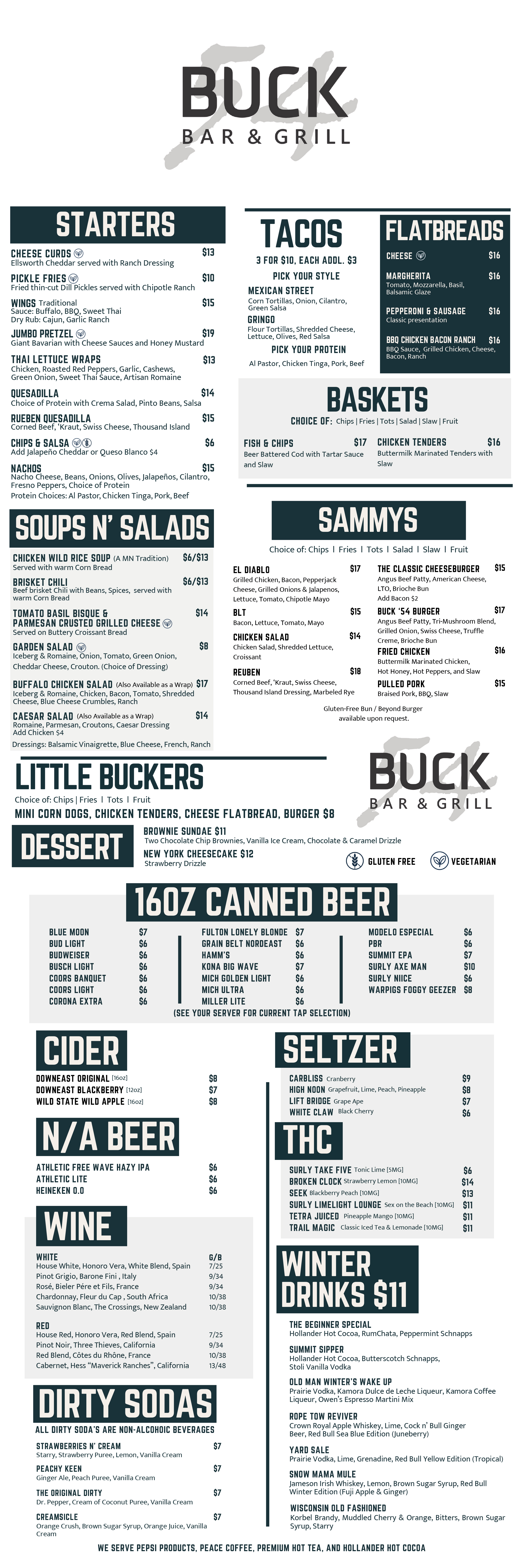 We're not just about the views, though they are something special. Our kitchen serves up hearty, delicious meals and we have incredible daily food and beverage specials that'll keep you coming back for more. At Buck ‘54 Bar & Grill, we combine the comfort of classic American dishes with a touch of modern flair. Here, home-cooked style meals get a fresh twist, creating plates both familiar and novel. Pair that with one of our craft cocktails or something from our ever-changing beer taps, and you're set for a good time. Our range of beverages, from weekly-rotating tap beers to craft cocktails, perfectly complements each bite - there's always something new to sip on.