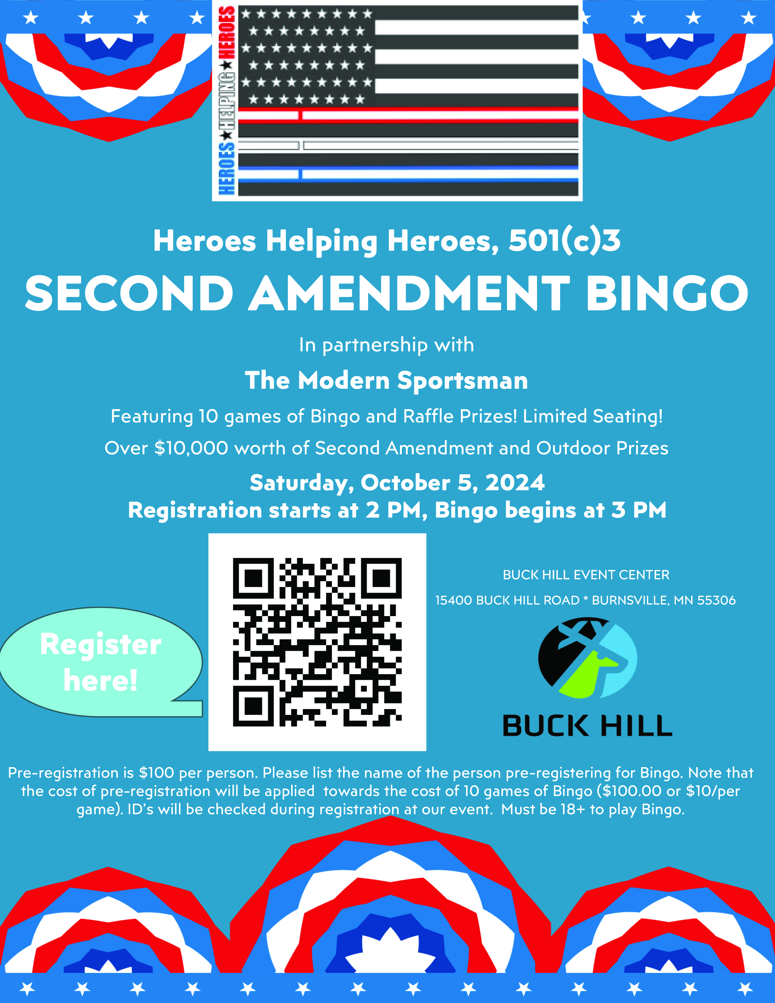 Heroes Helping Heroes, 501(c)3 is proud to announce our first annual SECOND AMENDMENT BINGO In partnership with The Modern Sportsman. Featuring 10 games of Bingo and Raffle Prizes! Limited Seating! Over $10,000 worth of Second Amendment and Outdoor Prizes Pre-registration is $100 per person. Please list the name of the person pre-registering for Bingo. Note that the cost of pre-registration will be applied towards the cost of 10 games of Bingo ($100.00 or $10/per game). ID’s will be checked during registration at our event. Must be 18+ to play Bingo.